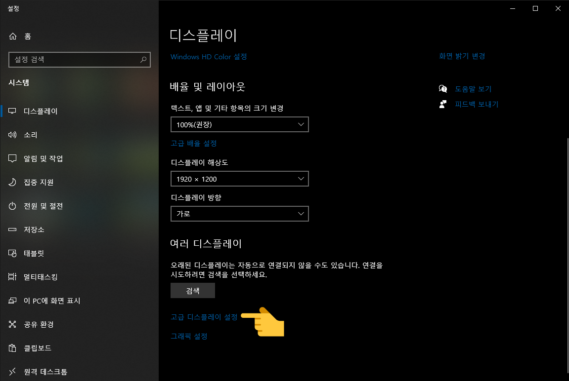 그런 다음 디스플레이에서 해상도를 보면 알 수 있겠지만 저것은 바탕화면 설정상태이니 넘어가서 고급 디스플레이 설정으로 들어가 줍니다.